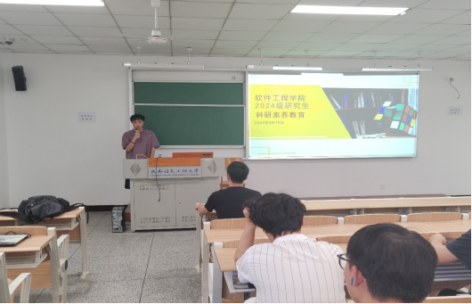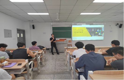 在第一教学楼H1202召开2024级研究生“培育科研素养,成就卓越研究生”新生入学教育主题班会。2022级杨宇杰学长分享科研实践经验,研究生辅导员张俊锋老师主持班会,全体2024级研究生出席。