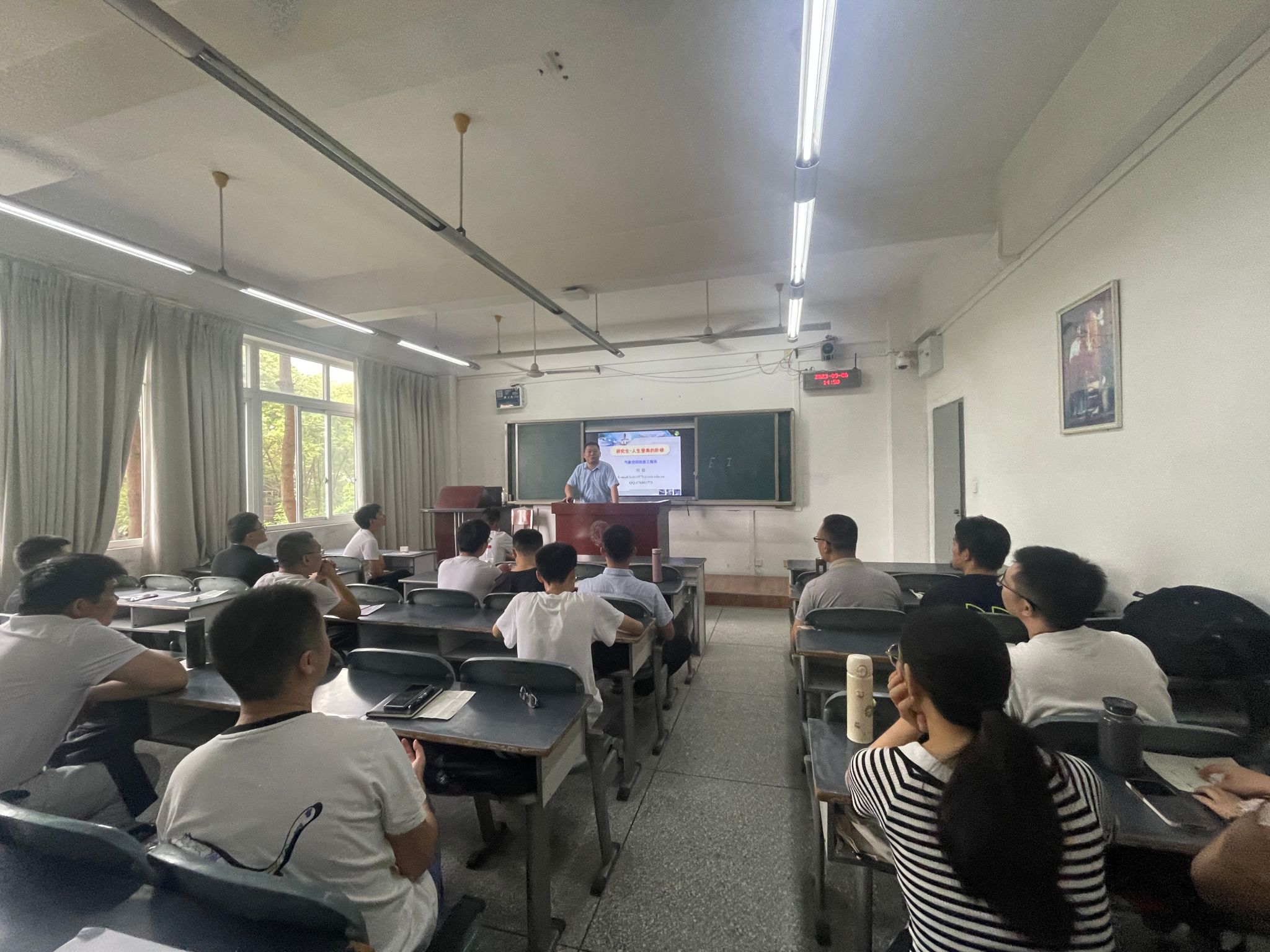 在信达楼举行2023级新生专业教育会。数据科学与工程系主任王亚强和气象空间信息工程系主任何磊,辅导员万娟及2023级顶通漫画