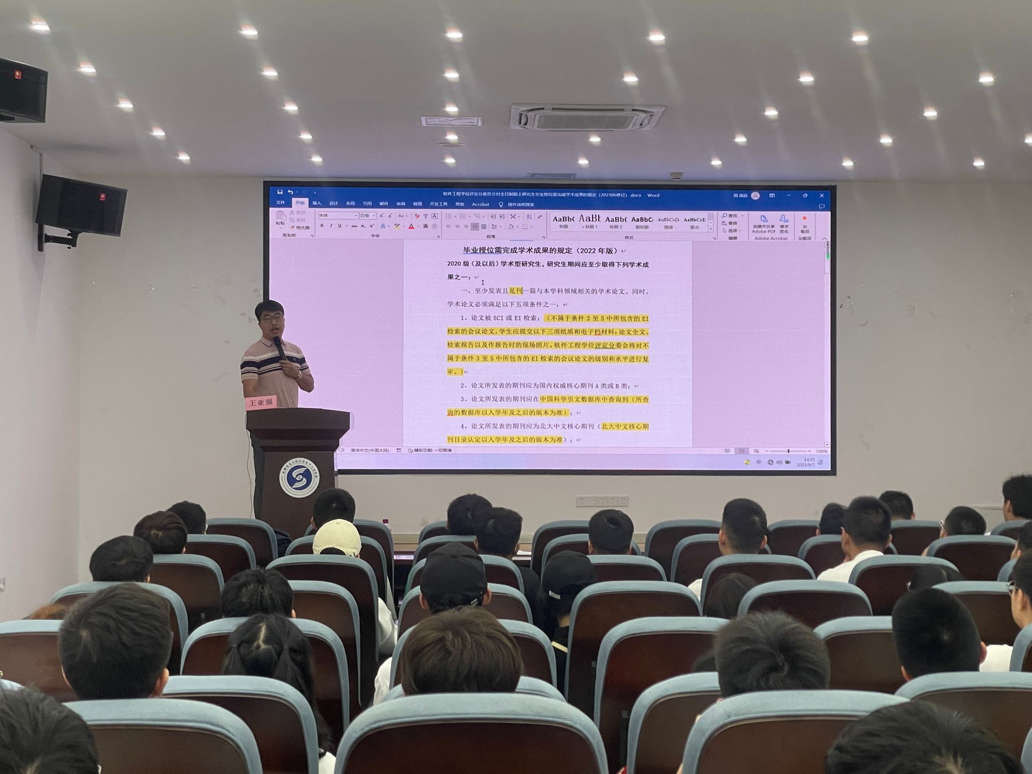 专业的发展历程和专业现状等,提出本专业的优势以及就业发展前景,介绍了全日制和非全的毕业要求,充分强调了学硕、专硕学术成果规定的严苛性,补充了专硕与学硕成果的差异性,使新生对软件工程专业毕业授位要求有了更加清晰的认识。提出5点研究生的“要与不要”:学生“要”积极与各自导师进行交流,发展独立自主的学习能力;学生“要”树立正确的道德价值观,“不要”因蝇头小利而放弃锻炼自身的机会;学生“要”拥有长远目标以及眼界,“不要”固步自封。也希望同学们在未来三年里,提高学术能力,提升工作技能。希望学生把研究生当作职业,积极主动,养好良好的生活习惯,提高自身专业水平,为了以后步入社会而努力。