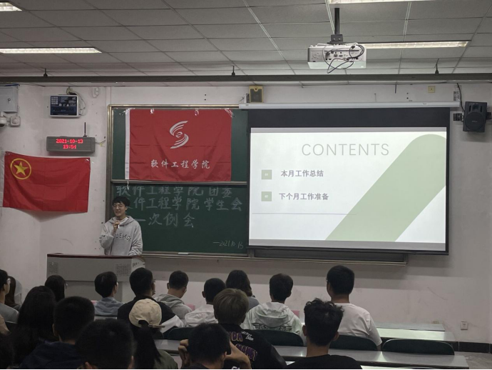 团委、学生会于2021年10月13日,在航空港校区4112教室召开了本学期第一次例会。团委书记胡培老师,团委副书记张澄老师,软工团委、学生会全体成员参与了本次例会。