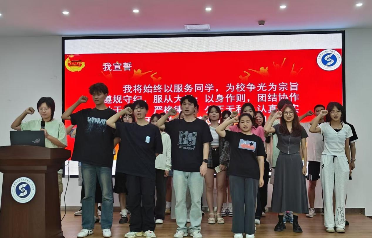 典礼在激昂的团歌声中拉开序幕。院团委、学生会负责人及各部门分别报告工作,系统回顾过去一年在强化引领、服务同学、推动校园文化建设中的付出与收获。随后,举行了象征传承的换届交接仪式,新任学生干部集体接过聘书,进行宣誓,誓言以热忱服务同学,正式开启履职新征程。