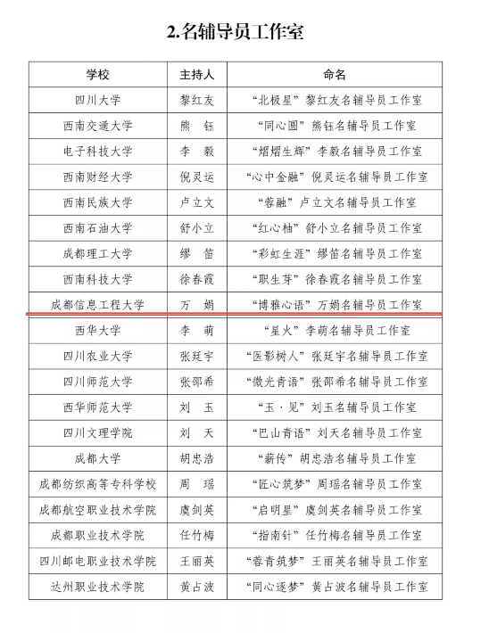 辅导员万娟经学校推荐,专家评审、省委教育工委和教育厅审核,确定为2021-2025第1批高校思想政治教育名师工作室——“博雅心语”名辅导员工作室主持人,将建设成立四川省高校思想政治教育名师工作室。