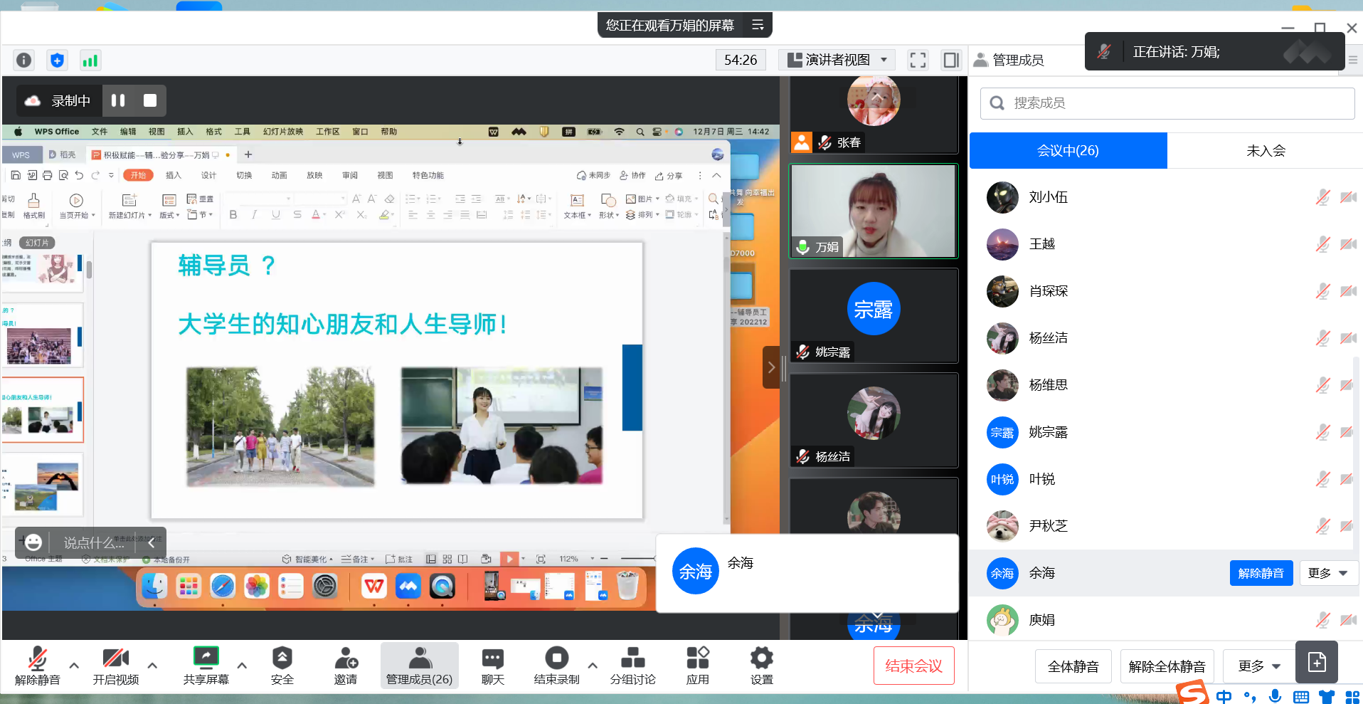 辅导员万娟结合名辅导员工作室的成长发展,分享了在学生管理、心理辅导、职业规划等方面的经验和方法,并探讨了在教育教学中如何更好地发挥辅导员的作用。