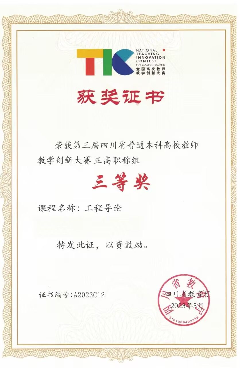 第三届四川省普通本科高校教师教学创新大赛(决赛)由四川省教育厅主办、四川省高等教育学会承办。顶通漫画 工程导论教师作为学校代表队参加了比赛,经过前期网络评等环节的激烈角逐,工程导论教师团队获正高组三等奖。