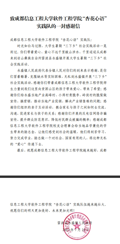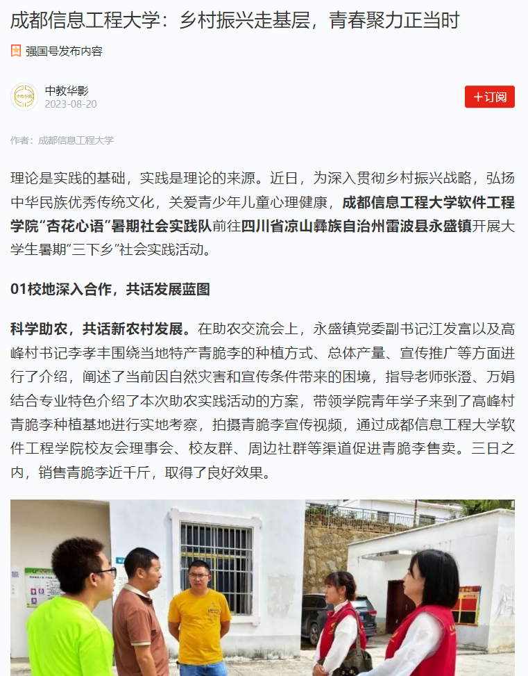 “杏花心语”大学生暑期社会实践队(四川省省级重点团队),在指导老师张澄、万娟的带领下前往雷波县永盛镇开展大学生暑期“三下乡”社会实践活动,助力乡村振兴。活动获得学习强国平台报道。