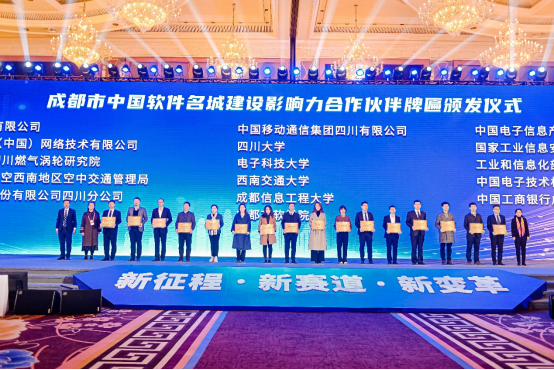 受颁了“成都市软件名城建设.影响力合作伙伴”牌匾,表彰学校、学院积极助力和参与成都软件行业发展、人才培养等工作。