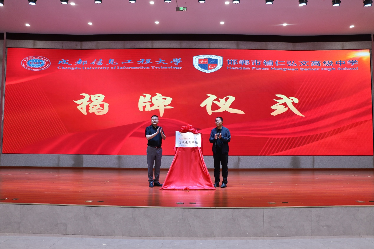,并代表学校向弘文中学授予“优质生源基地”牌匾。