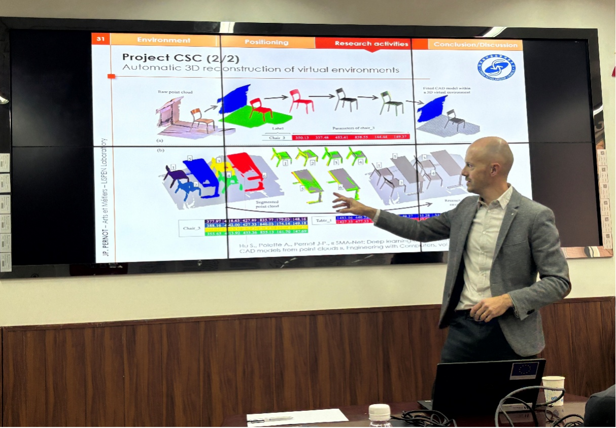 下午的学术专题讲座在信达楼B505继续举行。PERNOT教授以“数字模型和逆向工程的先进生成和处理的新范式”为题,系统阐释了其在计算机辅助设计、网格处理、数字孪生及人工智能赋能设计流程等方面的创新成果,并分享了指导中国国家留学基金委(CSC)奖学金博士生的经验。吕喆院士则以“精密尺寸测量的智能化研究”为主题,重点介绍了其在3D视觉高精度成像、机器人标定与视觉追踪等关键技术的突破。现场交流热烈,学术氛围浓厚。