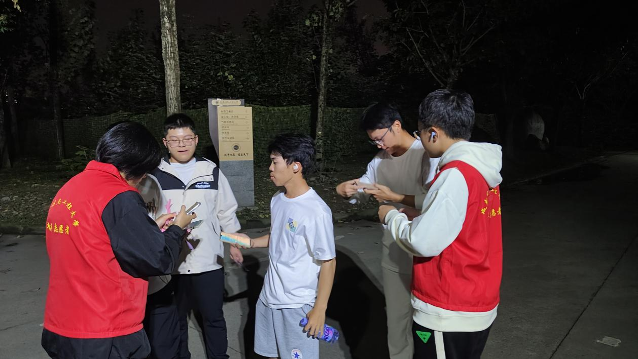 活动当晚,各参与者从第一田径场领取起点星条出发,在夜色中奔跑,欣赏着校园风光,感受着夜晚惬意。此次夜跑活动沿途设置了多个打卡点,并安排了志愿者在打卡点与参与者进行互动,让参与者在享受跑步乐趣的同时,也能感受到校园的友好氛围。参与者饱含对夜跑的热情,坚持不懈、互相扶持,最终所有人都完成5公里的夜跑目标。