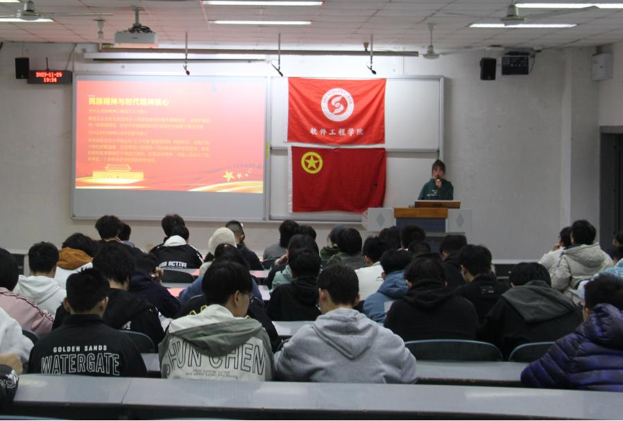 学生会主席陈宇瑶同学讲解,内容包括以爱国主义为重要的民族精神,以改革创新为重要的时代精神等。参与本堂团课的人员有团委人员,学生会组织部干部以及各级入团积极分子。